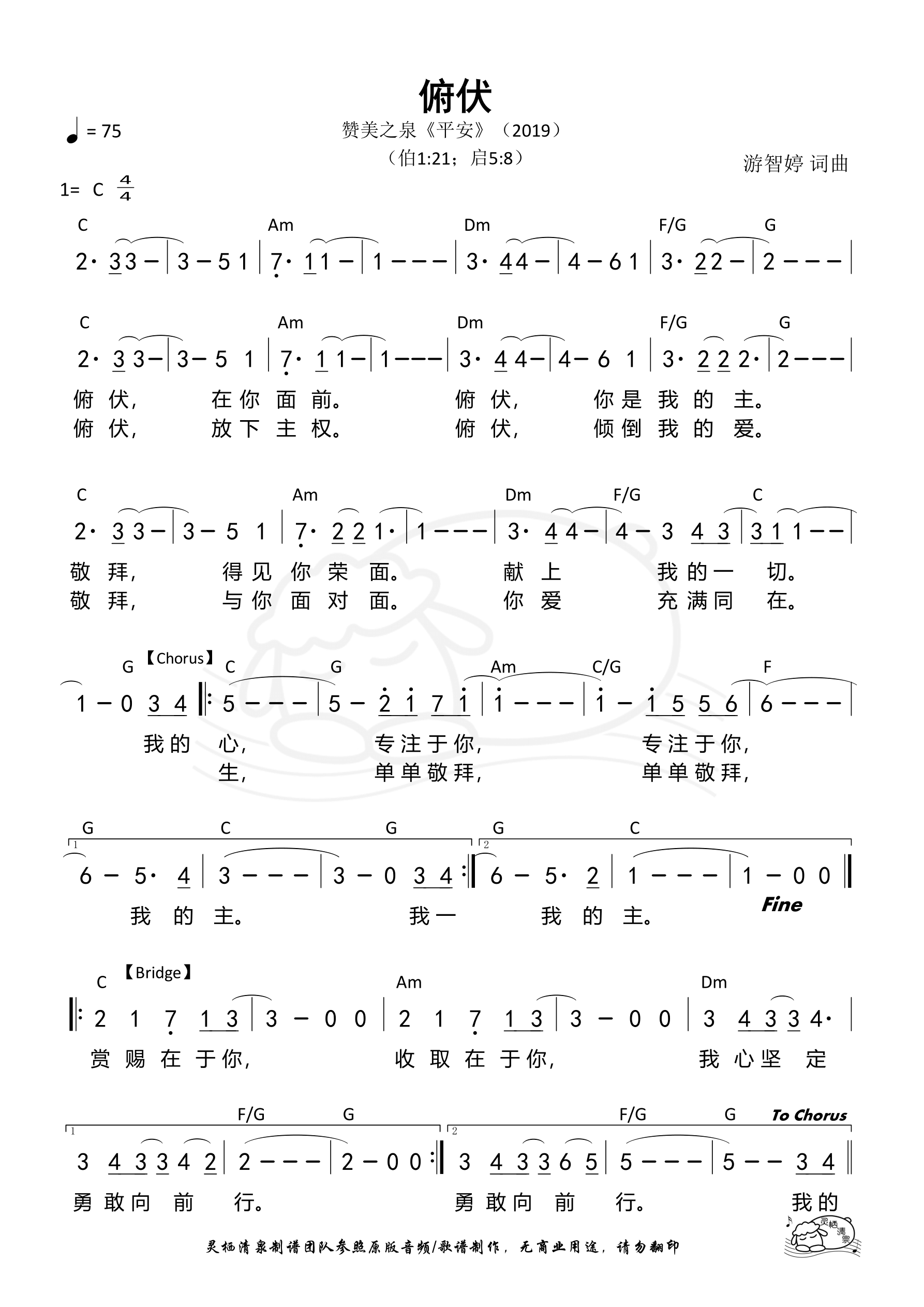 词曲:游智婷 歌手:赞美之泉 专辑:平安 发行:2019 Verse 1 俯伏 在你面前 俯伏 你是我的主 敬拜 得见你荣面 献上我的一切 Verse 2 俯伏 放下主权 俯伏 倾倒我的爱 敬拜 与你面对面 你爱充满同在 Chorus 1 我的心专注于你 专注于你我的主 Chorus 2 我一生单单敬拜 单单敬拜我的主 Bridge 赏赐在于你 收取在于你 我心坚定勇敢向前行
