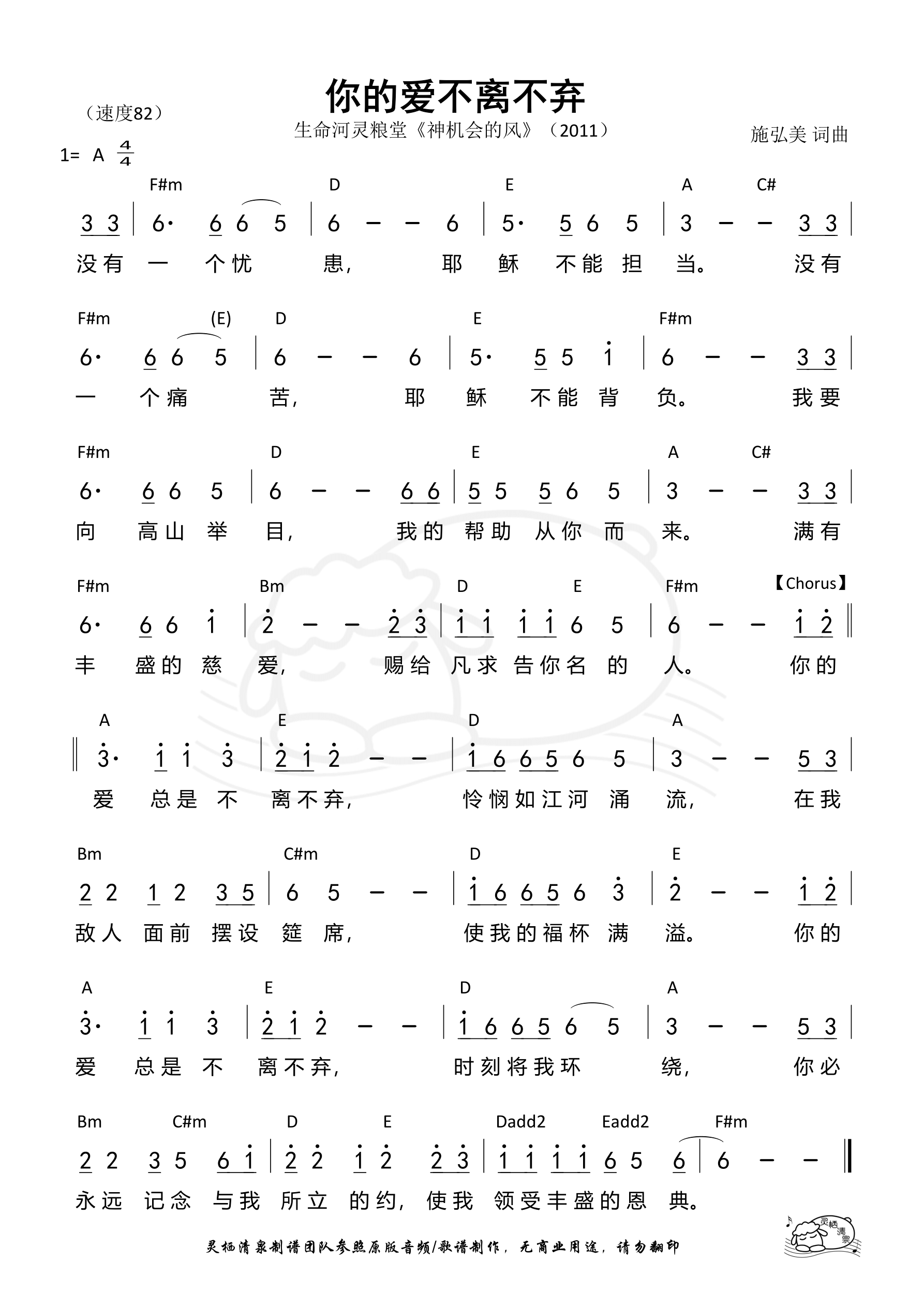 Verse 没有一个忧患 耶稣不能担当 没有一个痛苦 耶稣不能背负 我要向高山举目 我的帮助从你而来 满有丰盛的慈爱 赐给凡求告你名的人 Chorus 你的爱总是不离不弃 怜悯如江河涌流 在我敌人面前摆设筵席 使我的福杯满溢 你的爱总是不离不弃 时刻将我环绕 你必永远记念与我所立的约 使我领受丰盛的恩典
