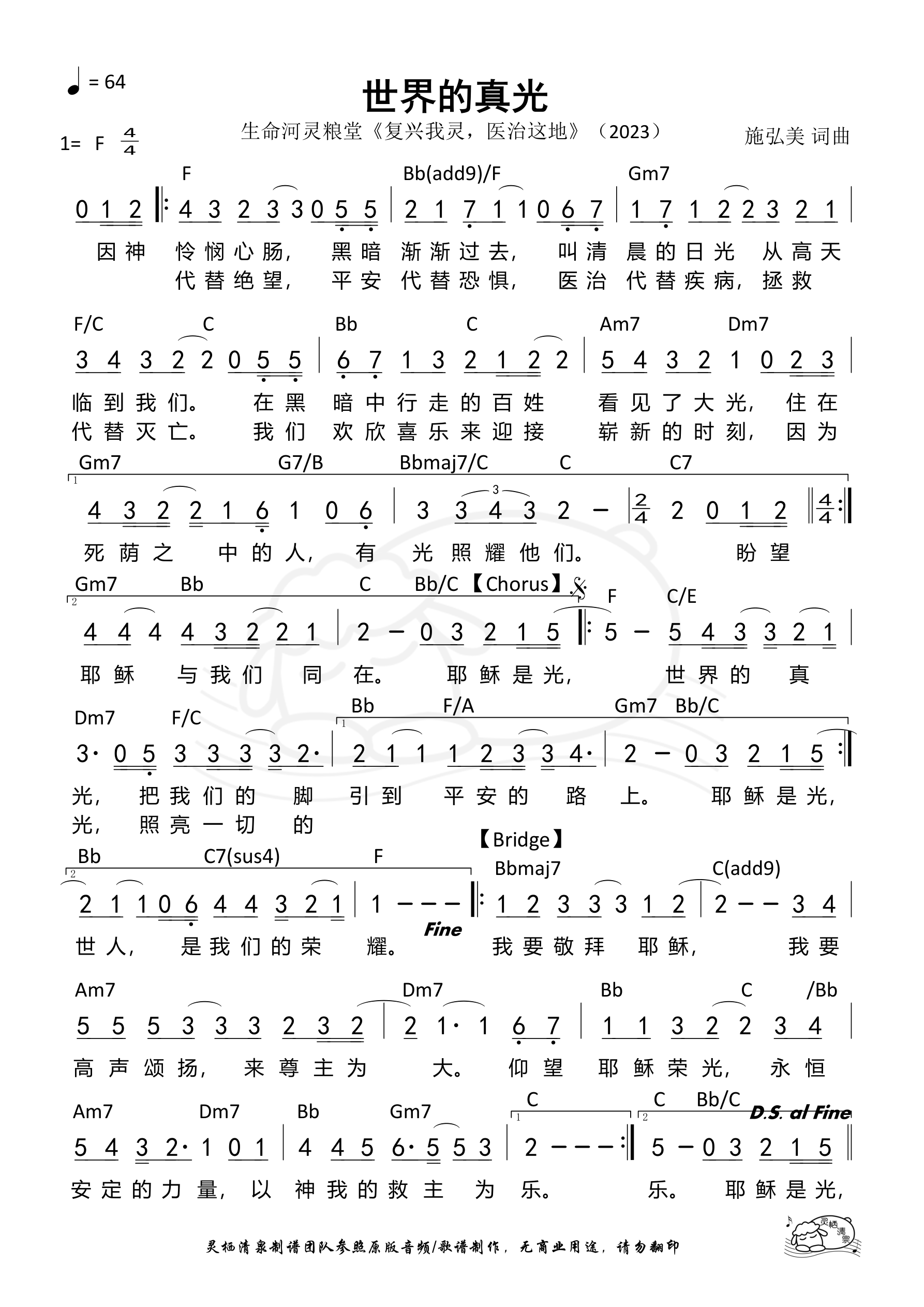 词曲:施弘美 歌手:生命河灵粮堂 专辑:复兴我灵,医治这地 发行:2023 Verse 因神怜悯心肠 黑暗渐渐过去 叫清晨的日光 从高天临到我们 在黑暗中行走的百姓 看见了大光 住在死荫之中的人 有光照耀他们 盼望代替绝望 平安代替恐惧 医治代替疾病 拯救代替灭亡 我们欢欣喜乐来迎接 崭新的时刻 因为耶稣与我们同在 Chorus 耶稣是光 世界的真光 把我们的脚引到 平安的路上 耶稣是光 世界的真光 照亮一切的世人 是我们的荣耀 Bridge 我要敬拜耶稣 我要高声颂扬 来尊主为大 仰望耶稣荣光 永恒安定的力量 以神我的救主为乐