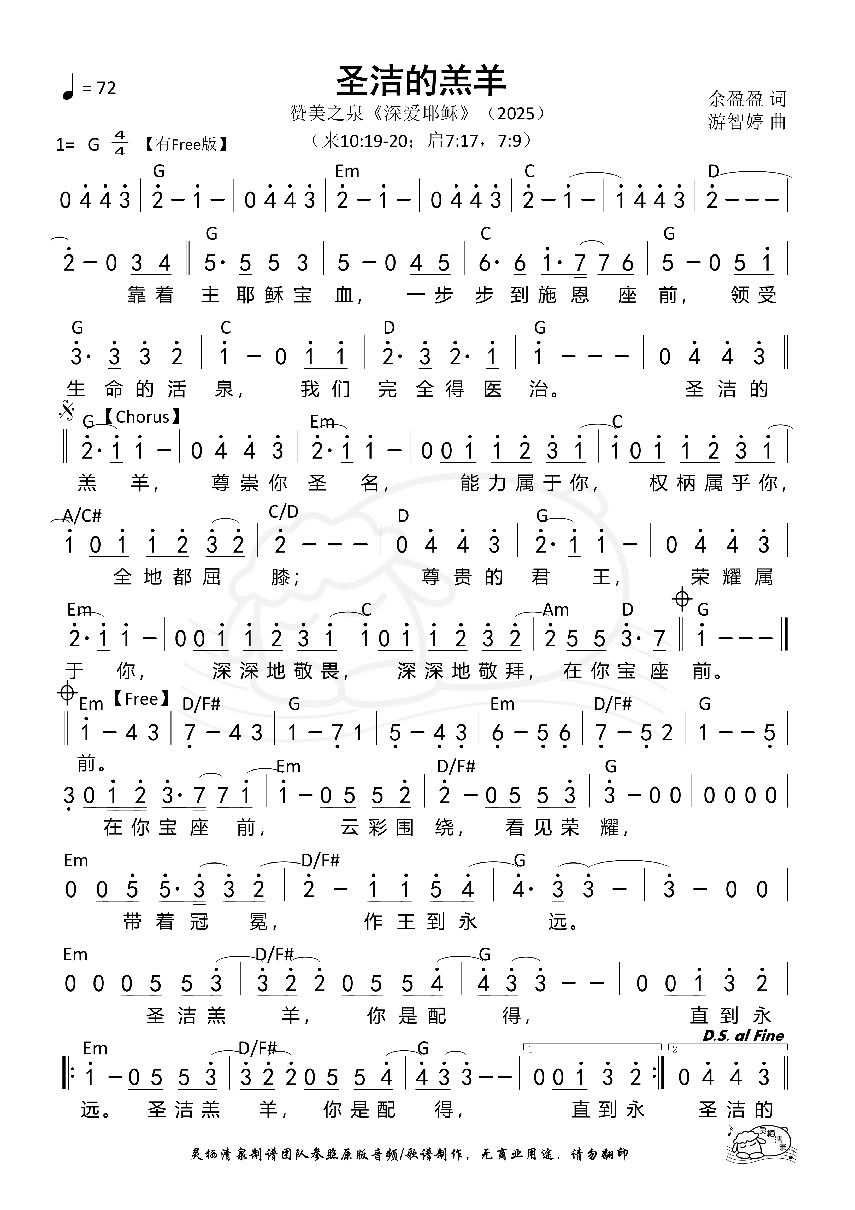 作词:余盈盈 作曲:游智婷 歌手:赞美之泉 专辑:深爱耶稣 发行:2025 Verse 靠着主耶稣宝血 一步步到施恩座前 领受生命的活泉 我们完全得医治 Chorus 圣洁的羔羊 尊崇你圣名 能力属于你 权柄属乎你 全地都屈膝 尊贵的君王 荣耀属于你 深深地敬畏 深深地敬拜 在你宝座前 Free 在你宝座前 云彩围绕 看见荣耀 带着冠冕 作王到永远 圣洁的羔羊 你是配得 直到永远 圣洁的羔羊 你是配得 直到永远