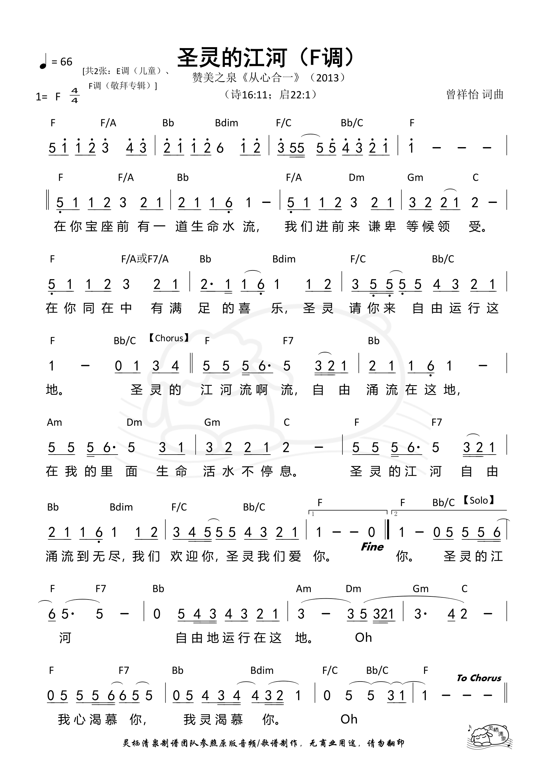 词曲:曾祥怡 歌手:赞美之泉 专辑:从心合一 发行:2013 Verse 在你宝座前 有一道生命水流 我们进前来 谦卑等候领受 在你同在中 有满足的喜乐 圣灵请你来 自由运行这地 Chorus 圣灵的江河流啊流 自由涌流在这地 在我的里面 生命活水不停息 圣灵的江河 自由涌流到无尽 我们欢迎你 圣灵我们爱你 Free 圣灵的江河 自由地运行在这地 我心渴慕你 我灵渴慕你