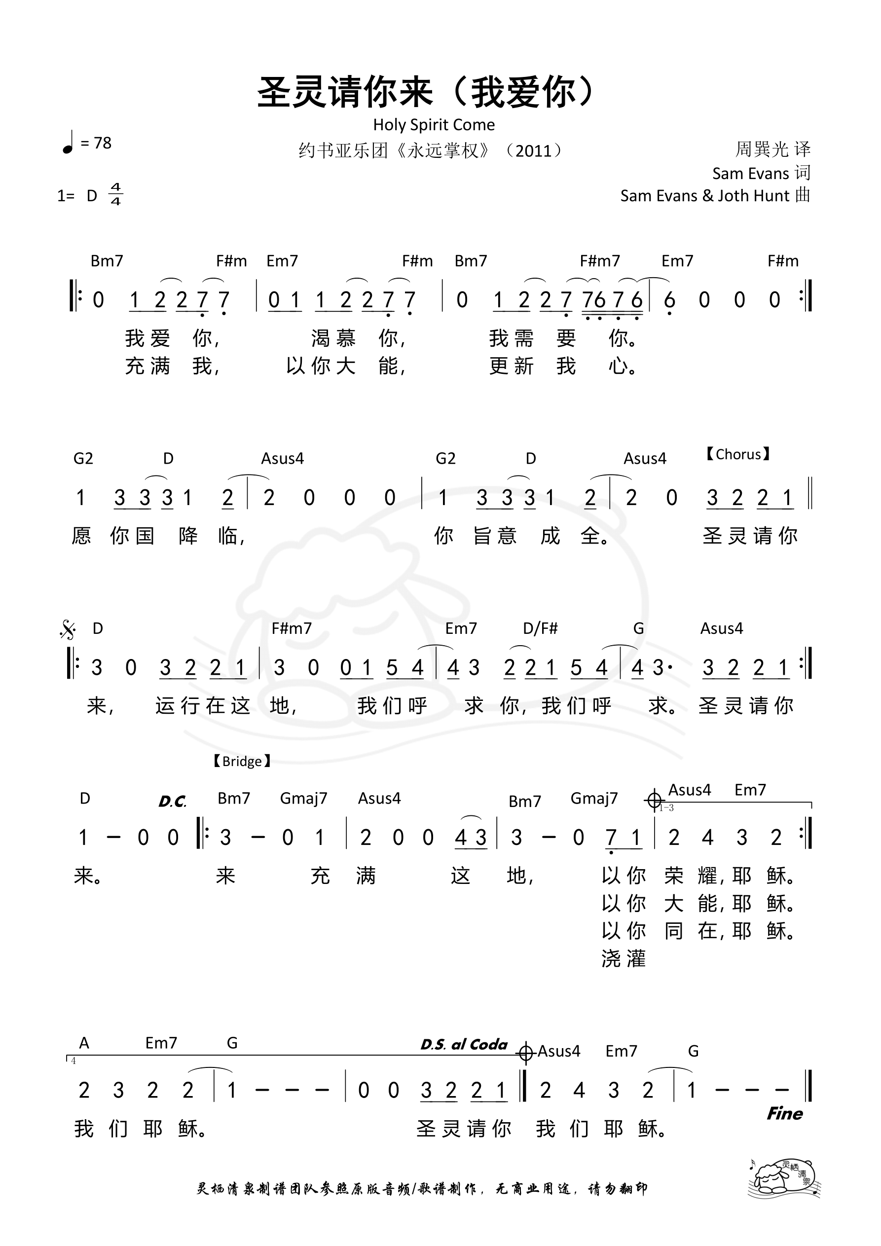 作词:Sam Evans 作曲:Sam Evans & Joth Hunt 歌手:约书亚乐团 专辑:永远掌权 发行:2011 Verse 我爱你 渴慕你 我需要你 充满我 以你大能 更新我心 愿你国降临 你旨意成全 Chorus 圣灵请你来 运行在这地 我们呼求你 我们呼求 圣灵请你来 Bridge 来充满这地 以你荣耀 耶稣 来充满这地 以你大能 耶稣 来充满这地 以你同在 耶稣 来充满这地 浇灌我们 耶稣