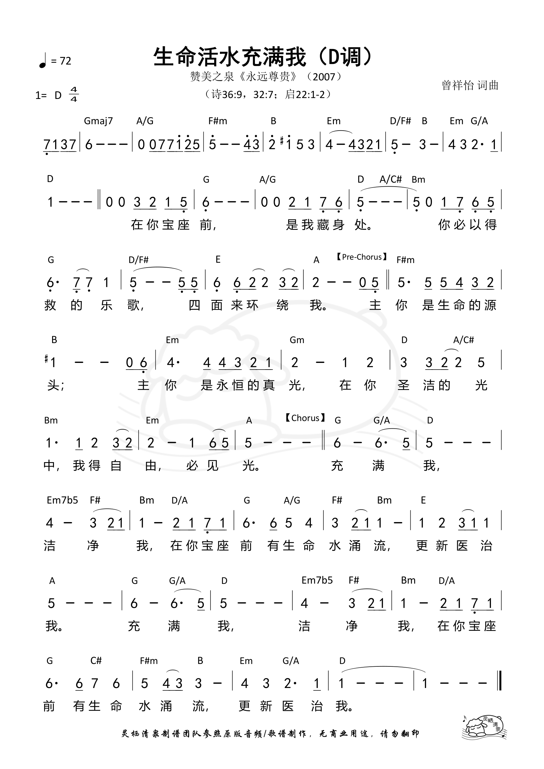 词曲:曾祥怡 歌手:赞美之泉 专辑:永远尊贵 发行:2007 Verse 在你宝座前 是我藏身处 你必以得救的乐歌 四面来环绕我 主你是生命的源头 主你是永恒的真光 在你圣洁的光中 我得自由必见光 Chorus 充满我 洁净我 在你宝座前 有生命水涌流 更新医治我 充满我 洁净我 在你宝座前 有生命水涌流 更新医治我