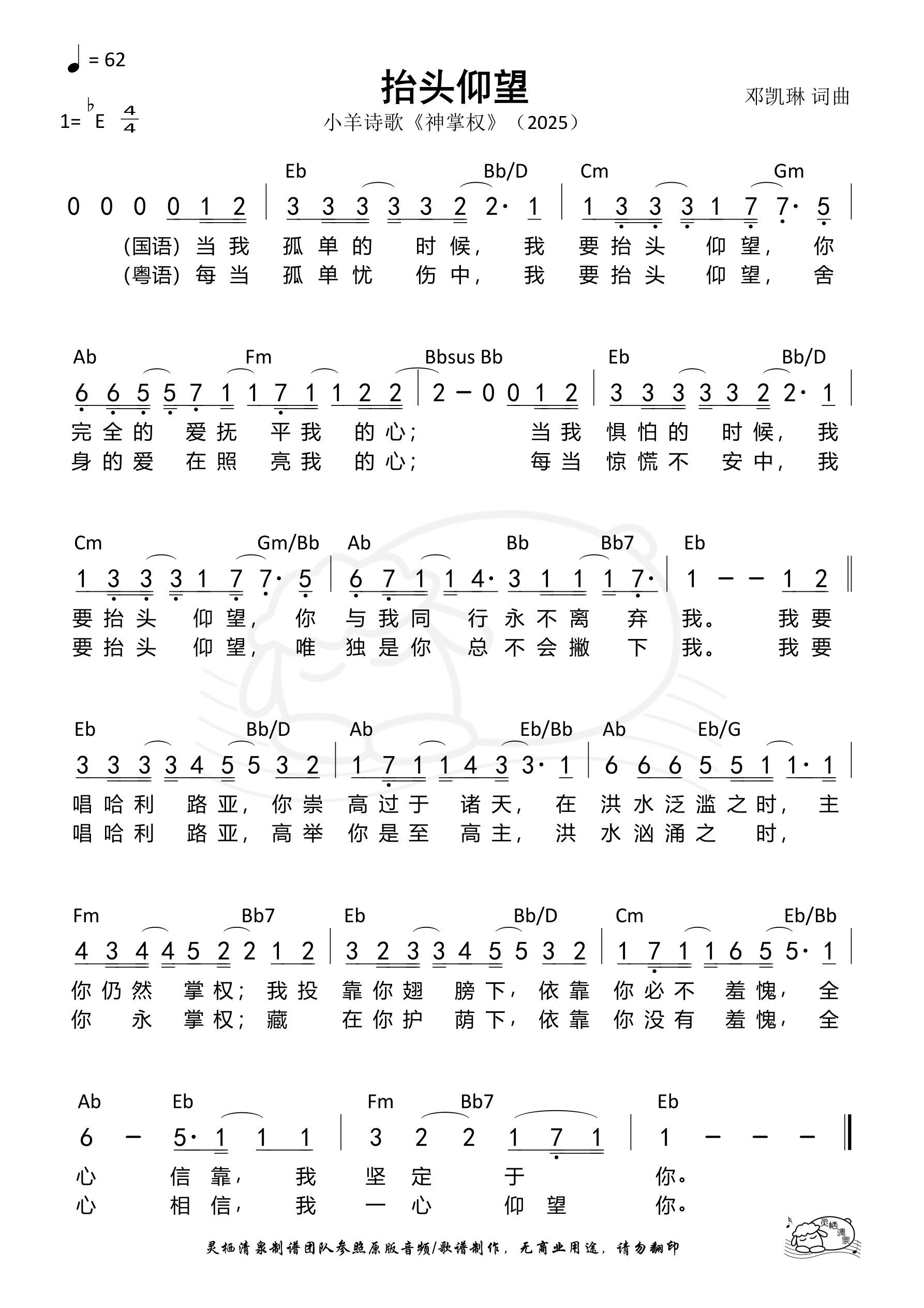 词曲:邓凯琳 歌手:小羊诗歌 专辑:神掌权 发行:2025 Verse 当我孤单的时候 我要抬头仰望 你完全的爱 抚平我的心 当我惧怕的时候 我要抬头仰望 你与我同行 永不离弃我 Chorus 我要唱哈利路亚 你崇高过于诸天 在洪水泛滥之时 主你仍然掌权 我投靠你翅膀下 依靠你必不羞愧 全心信靠 我坚定于你