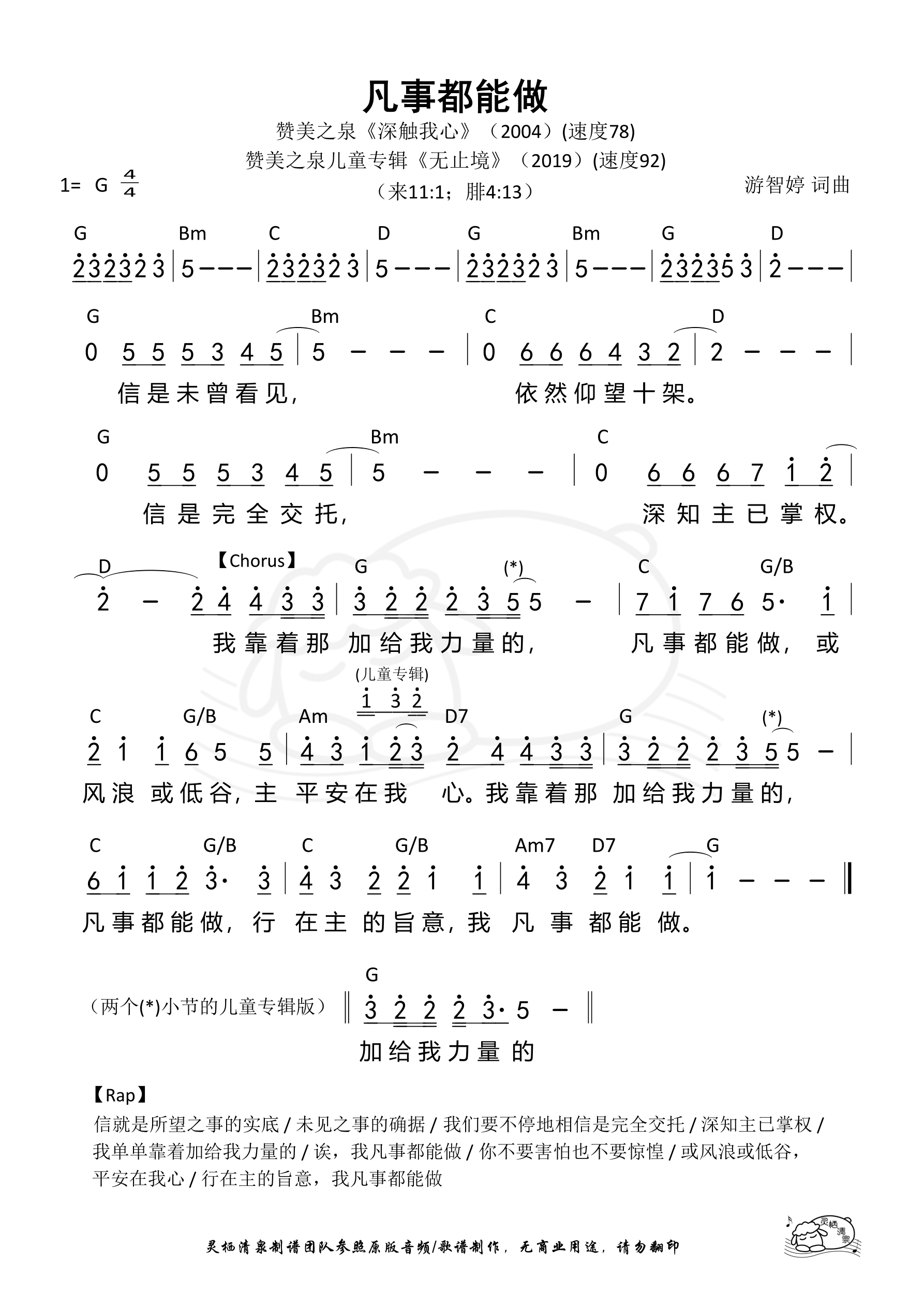 Verse 信是未曾看见 依然仰望十架 信是完全交托 深知主已掌权 Chorus 我靠着那加给我力量的 凡事都能做 或风浪或低谷 主平安在我心 我靠着那加给我力量的 凡事都能做 行在主的旨意 我凡事都能做