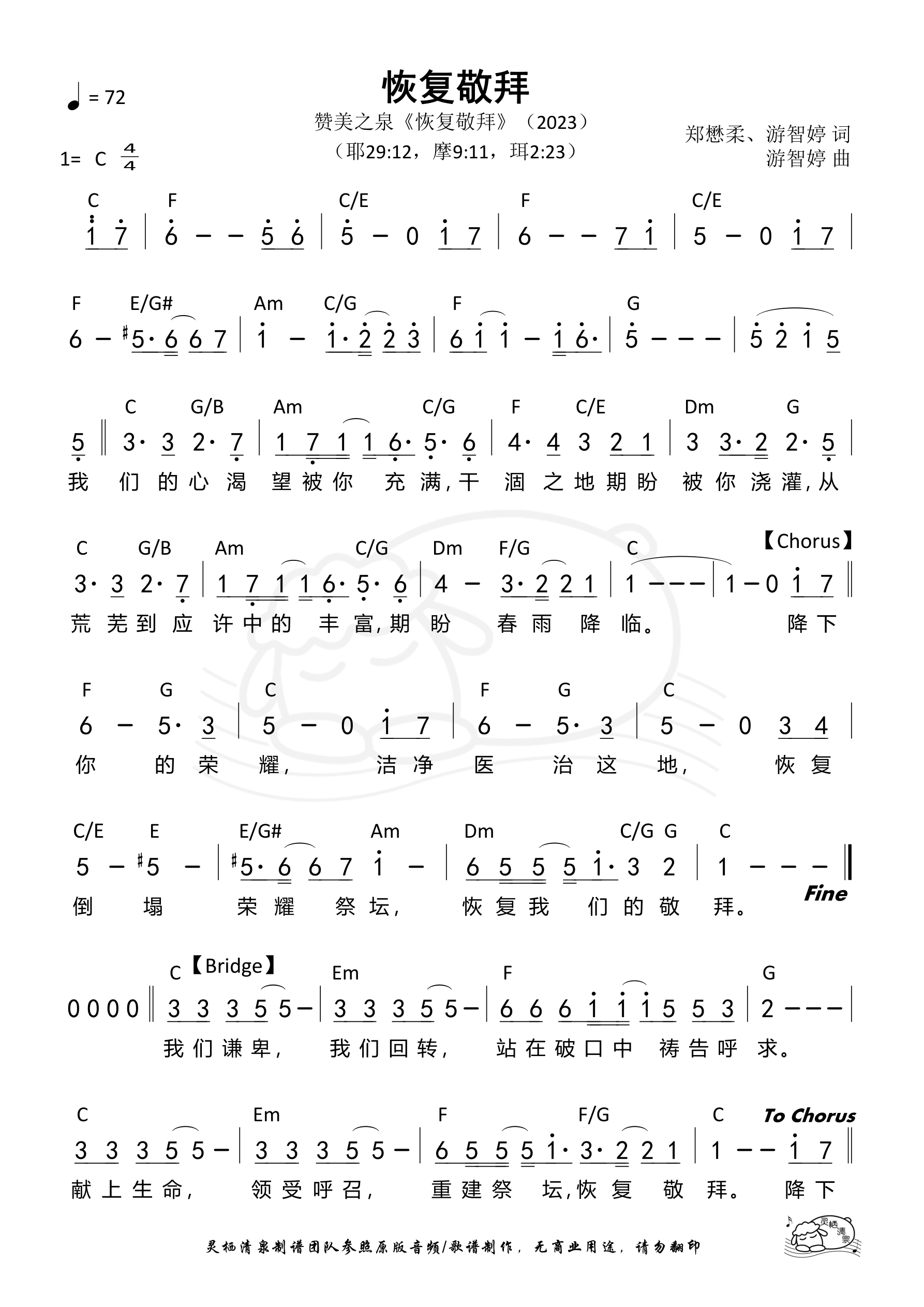 作词:郑懋柔 游智婷 作曲:游智婷 歌手:赞美之泉 专辑:恢复敬拜 发行:2023 Verse 我们的心渴望被你充满 干涸之地期盼被你浇灌 从荒芜到应许中的丰富 期盼春雨降临 Chorus 降下你的荣耀 洁净医治这地 恢复倒塌荣耀祭坛 回复我们的敬拜 Bridge 我们谦卑 我们回转 站在破口中祷告呼求 献上生命 领受呼召 重建祭坛 恢复敬拜
