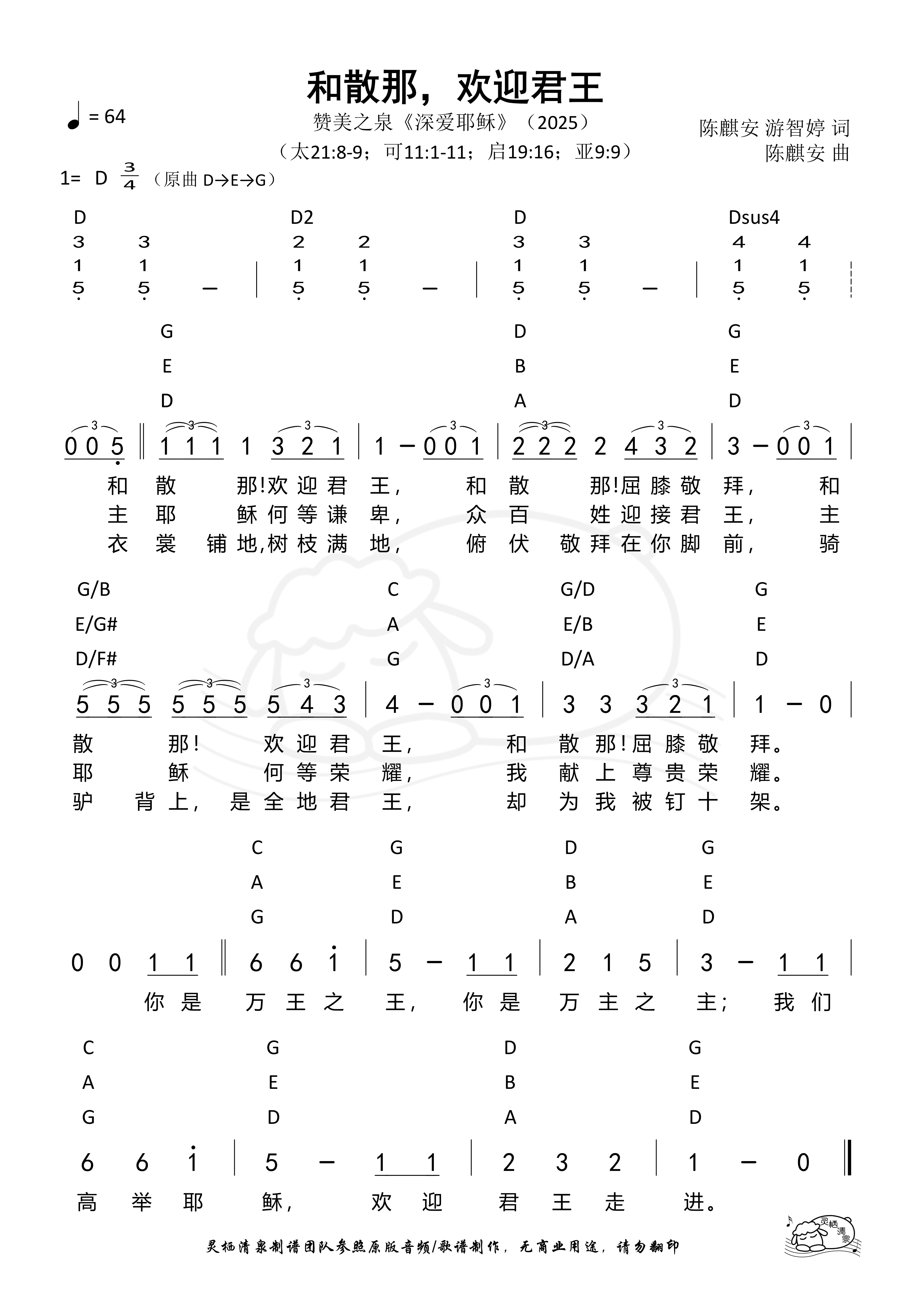 作词:陈麒安 游智婷 作曲:陈麒安 歌手:赞美之泉 专辑:深爱耶稣 发行:2025 Verse 1 和散那 欢迎君王 和散那 屈膝敬拜 和散那 欢迎君王 和散那 屈膝敬拜 Verse 2 主耶稣何等谦卑 众百姓迎接君王 主耶稣何等荣耀 我献上尊贵荣耀 Verse 3 衣裳铺地 树枝满地 俯伏敬拜 在你脚前 骑驴背上是全地君王 却为我被钉十架 Chorus 你是万王之王 你是万王之主 我们高举耶稣 欢迎君王走进