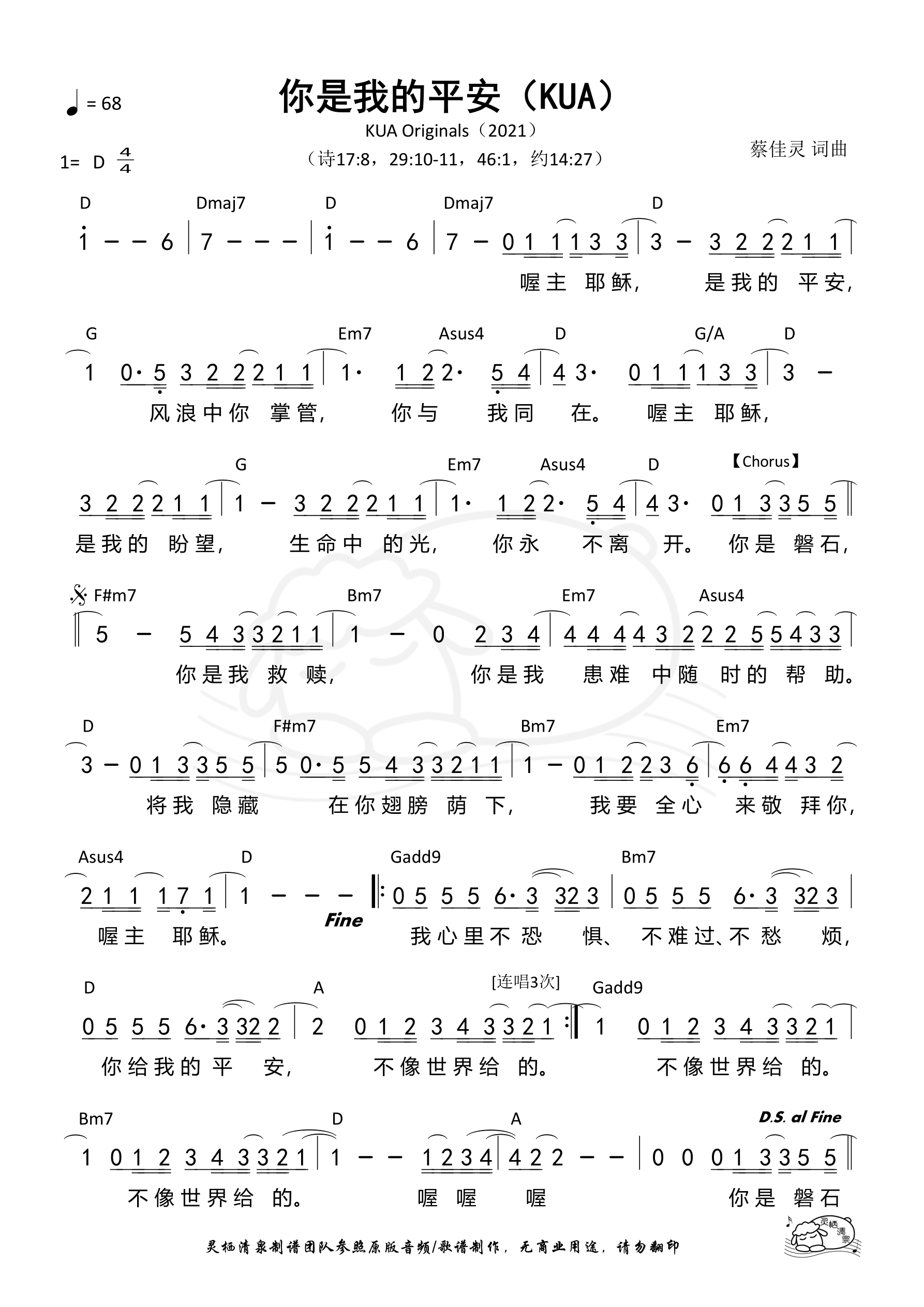 词曲:蔡佳灵 歌手:KUA 发行:2021 Verse 哦 主耶稣是我的平安 风浪中你掌管 你与我同在 哦 主耶稣是我的盼望 生命中的光 你永不离开 Chorus 你是磐石 你是我救赎 你是我患难中随时的帮助 将我隐藏在你翅膀荫下 我要全心来敬拜你 哦主耶稣 Bridge 我心里不恐惧 不难过不愁烦 你给我的平安 不像世界给的 不像世界给的 不像世界给的 哦 ~