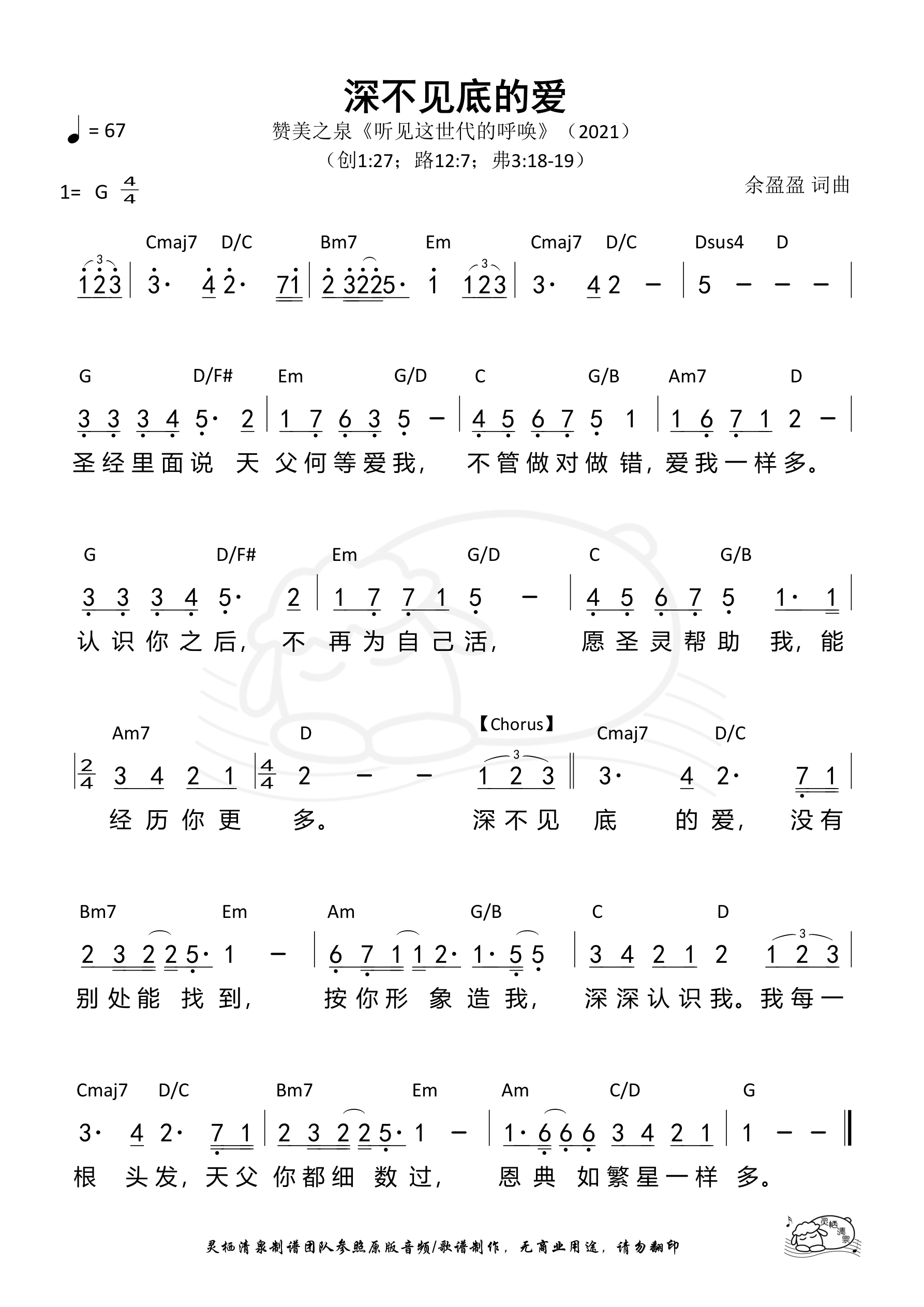 词曲:余盈盈 歌手:赞美之泉 专辑:听见这世代的呼唤 发行:2021 Verse 圣经里面说 天父何等爱我 不管做对做错 爱我一样多 认识你之后 不再为自己活 愿圣灵帮助我 能经历你更多 Chorus 深不见底的爱 没有别处能找到 按你形象造我 深深认识我 我每一根头发 天父你都细数过 恩典如繁星一样多